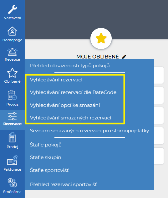 V hlavním menu Rezervace najdete 4 hlavní reporty pro vyhledávání rezervací