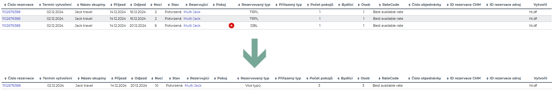 Data v reportu je také možné seskupit pomocí tickboxu "Seskupit dle rezervací". V těle reportu se následně seskupí rezervace podle čísla rezervace na jeden řádek reportu a ve sloupcích se agregují data z dané rezervace. Díky tomu získáte snadný přehled o skupinových rezervacích. Aby zůstal report přehledný, některá data při agregaci nejsou v reportu zobrazována, zejména více typů pokojů, rate codes, bydlících atd.