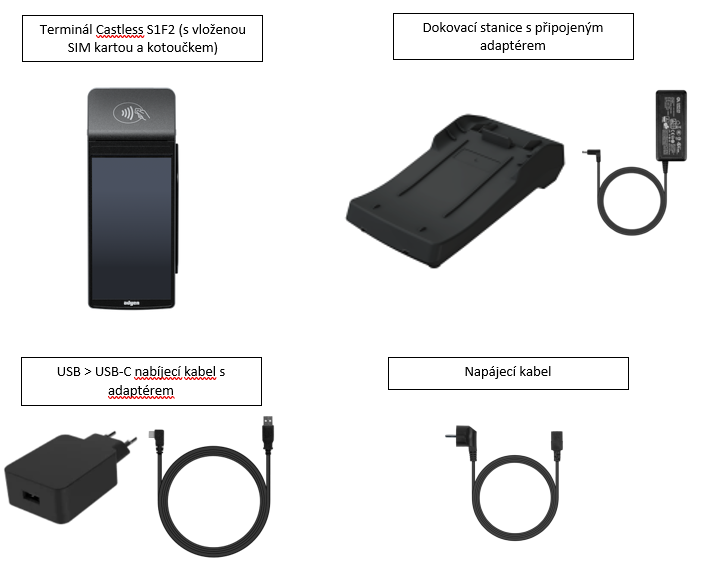 • Nabíječka USB > USB-C s adaptérem k platebnímu terminálu (tu si bezpečně uložte a použijte v případě poškození dokovací stanice)