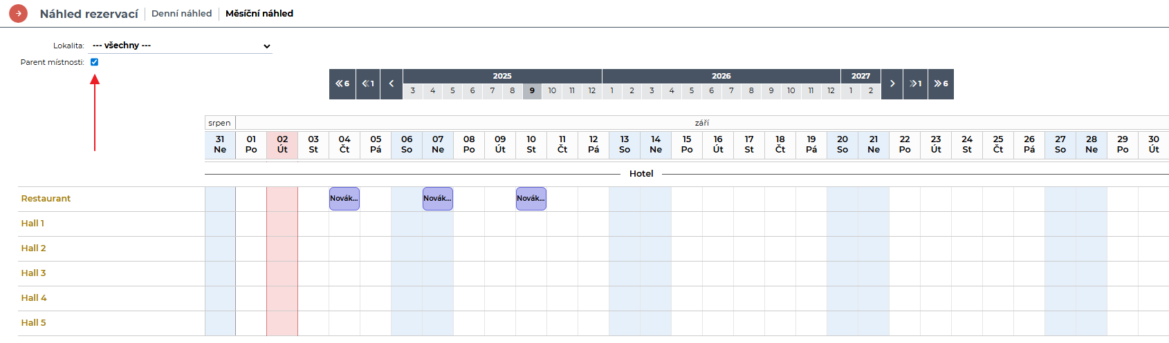 Pojďme se podívat na zobrazení přehledu rezervací v Conferu pomocí Denního nebo Měsíčního náhledu. Oba najdete v levém menu v jeho horní části.