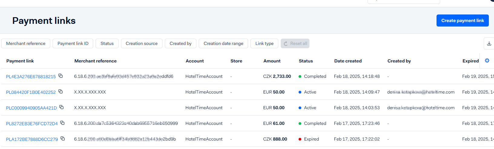 Tip: Payment links can also be created directly in the Adyen portal under Payment Links. Note! These manually created links are not connected to HotelTime, and received payments must be manually entered into the application.If you have any questions or suggestions, do not hesitate to contact our customer support.