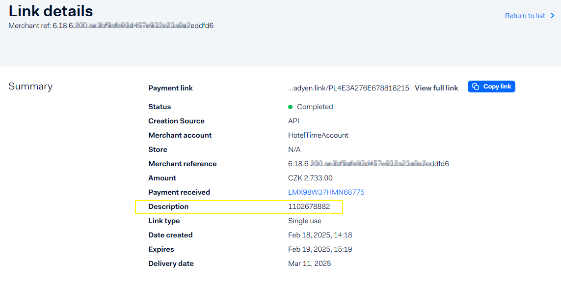 Clicking the link ID in the first column of the report takes you to its details, where you can see the transaction description you entered when creating the link in HotelTime. If the link is already paid (marked as Completed in Adyen), the payment appears in the transaction list, just like standard online or terminal payments.