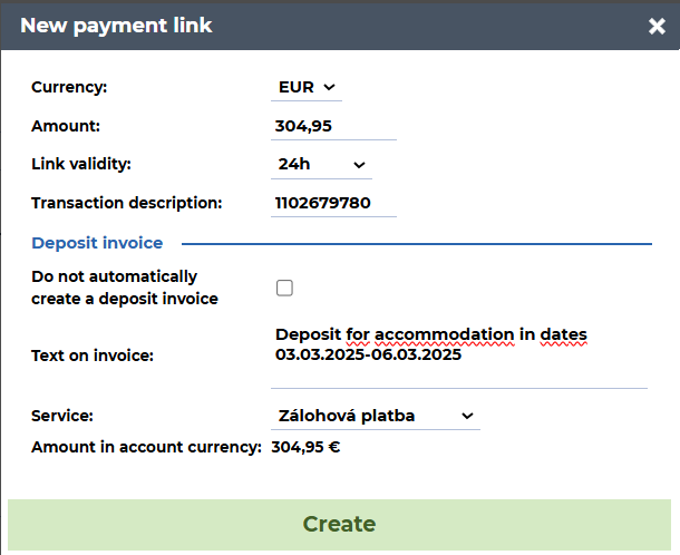 After the guest pays via the link, HotelTime automatically generates a deposit invoice. If you do not wish to generate a deposit invoice for a specific link, select Do not automatically create a deposit invoice. In this case, an external payment will be created in the reservation upon payment, which you can manually reconcile later.
