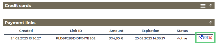 - The envelope icon enables sending the payment link via email directly from HotelTime.