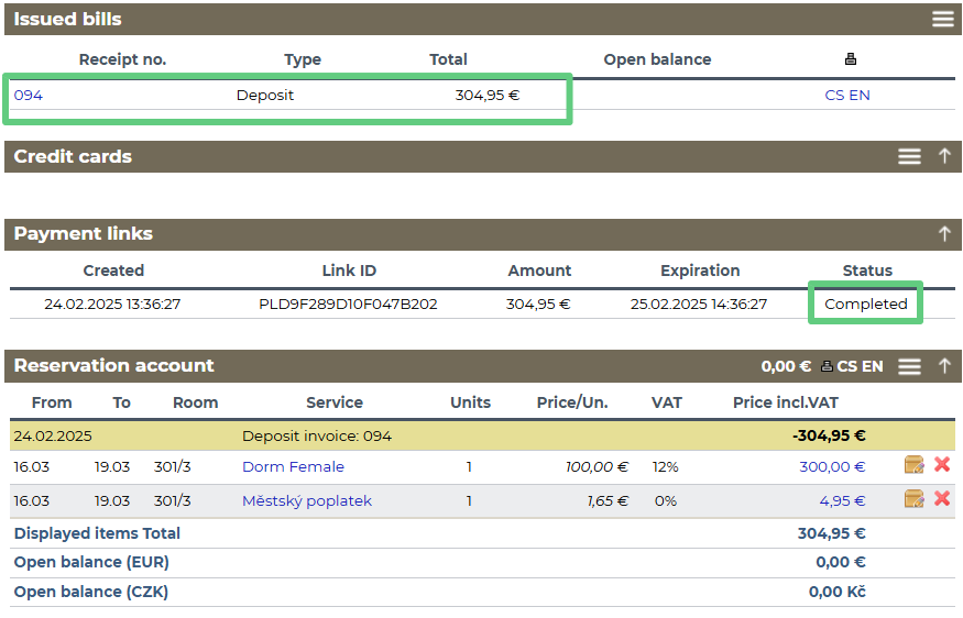 - If deposit invoice creation was disabled, an external payment is created in the reservation.